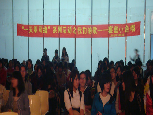 一天零网络系列活动之"我们的歌--寝室小合唱"决赛在大学生活动中心多功能厅拉开了序幕。来自音乐学院的评委王倩和球探体育