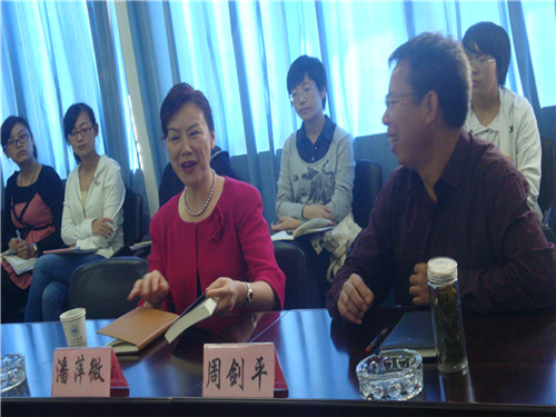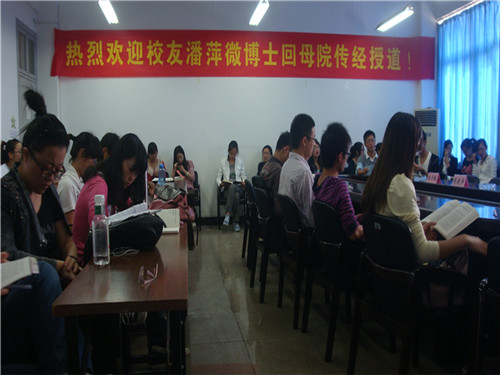 10月21日上午9点30分,在人文楼311教室举行了欢迎校友潘萍微博士回母校的交流会。出席本次交流会的有原温师专学子,现任美国见佳天然药业董事长的潘萍微博士,院党总支书记周剑平老师,学生科副科长曾蓓蕾老师,学生辅导员麻法全老师,还有毕业班学生党员和研究生。