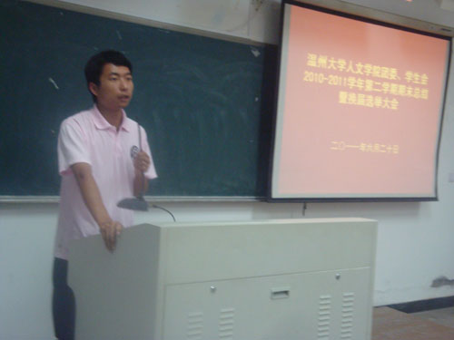 首先由学生会主席陈辉宣布此次大会的各项议程,大会将重点讨论这一学期以来学生工作的进程,需要解决的问题和关于换届人员安排的相关事宜。大会伊始,每位部长针对本部门在这一学期以来工作中的进展做了简要总结,大家共同反思一起讨论为这一学期的辛苦工作画上了一个圆满的句号。接着五位主席团成员轮流发表讲话,在学生会工作的几年他们每个人都付出了很多。回忆中有苦也有甜,有欢笑也有泪水,从他们的收获与成长中,我们也看到了团委学生会这个大家庭在一步步走向成熟,变得更加优秀。紧接着其他团学干部怀着真挚的感情,表达了在团委学生会工作的这段时间的感想和体悟,台下掌声不断,气氛感人。最后麻老师宣读了下学期团委学生会的改革方案以及具体的人员安排。