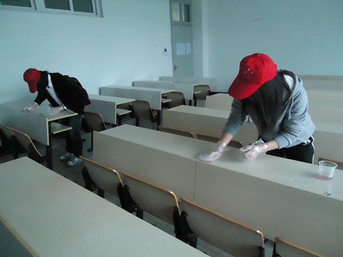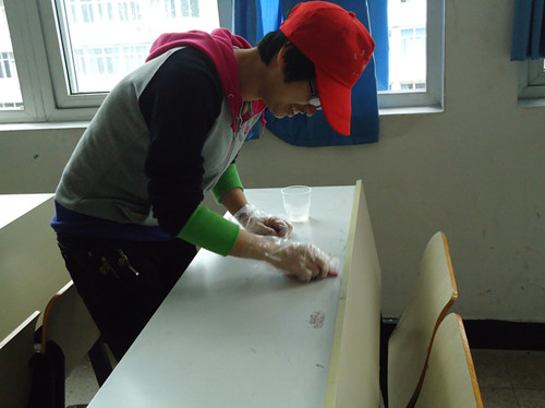 一点半左右,志愿者们在人文楼的停车场集合、分工。其中还发生了不完美的事情:由于事事先对场地的错误估计,致使此次的活动场地减少为2个大教室、2个小教室,每个大教室6名同学,每个小教室3名同学。导致还有好几个"问题教室"没办法解决,为这次活动留下了遗憾。小队长将事先准备好的塑料套、香蕉水、抹布、杯子发给志愿者,一切准备就绪后,志愿者正式开始"战斗"。清理"问题课桌"是一项艰巨的任务,看着课桌上被个别同学胡乱涂画的惨状,志愿者们感到失望和痛心,但同时也坚定了大家消灭"惨状"的决心。将少量香蕉水倒在课桌上,用抹布来回不断地擦洗,在大家的共同努力之下,原本乱七八糟的课桌变得干净了,基本恢复了其美貌。但也有个别课桌涂画特别的严重,志愿者尝试了几次,也未能清除干净,这又是这次活动中的一个不足。希望在教室里上课的同学们可以手下留情,我们的桌子也是会哭的。