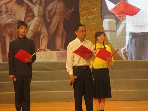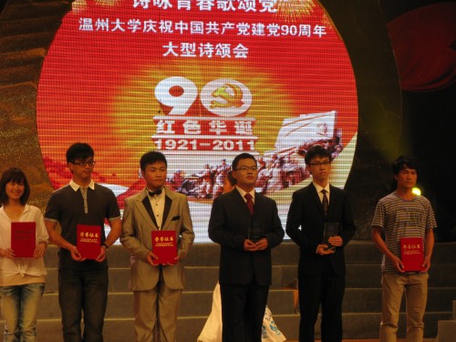 党总支副书记骆锤炼老师等全校师生代表共同演绎原创诗朗诵《党建纪元逾九十 歌颂党史唱温大》,令全场激情澎湃、荡气回肠,晚会达到高潮。大会在全场起立齐唱校歌的庄严氛围中,将爱党荣校的精神“润物细无声”深植入了全体温大人的心中。在上周三上演的庆祝建党九十周年诗歌朗诵大赛中,《我的祖国》获得群诵组第二名的好成绩,同时也荣获了“优秀创作奖”奖项。