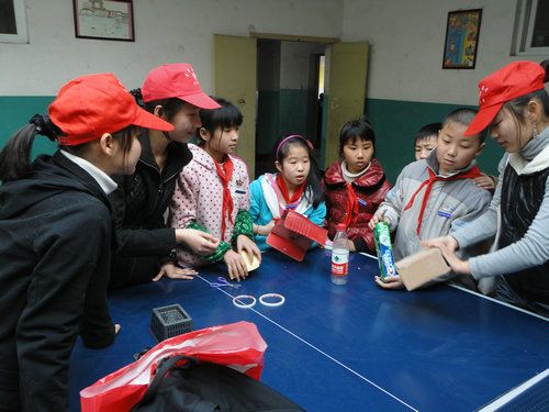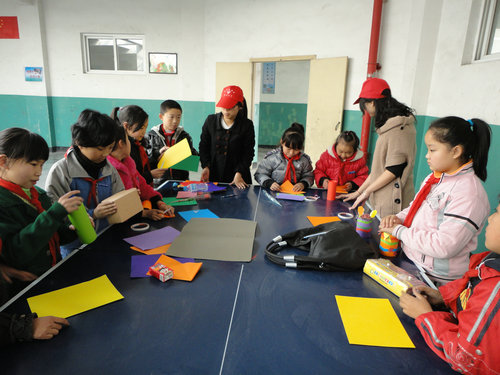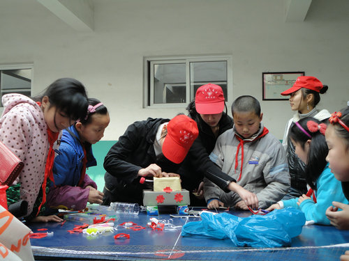 下午1点40分,志愿者们抵达益民学校。本次活动以小组为单位,每组约有七八个成员,分4组开展。特别指出的是,本次活动不是以课堂的形式开展,而是在学校体育活动室的乒乓球台上进行。从而给予了小朋友更多的活动与交流空间。活动材料包括各种回收的物品:有可乐罐、雨伞、衣服、硬纸板、皮包等等。志愿者们和小朋友一起发挥创意,裁剪、拼贴、画图,做出了各种类型的新鲜玩意儿。其中有个小朋友将一件衣服制成了颇具苏格兰风味的女士帽,吸引了好些小男孩。还有个组利用硬纸板,双面胶,小篮子,可乐瓶的头部组装成了一辆小坦克……志愿者们将新鲜有趣的实践活动带到课堂,通过交流指导合作提高了小朋友们的实践操作能力,活动进行顺利,教学效果良好。