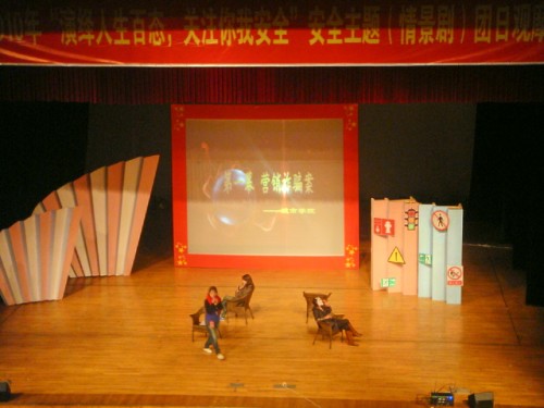 情景剧开幕之前,温州大学保卫处副处长张有全老师做了简短的校园安全形势通报,呼吁广大同学提要防范意识,增强技能,做好校园安全工作。接下来进行的是精彩的情景剧表演,城市学院表演的《营销诈骗案》讲述了在校大学生为经不住骗子高额创业回报幌子下的诱惑,向同学借钱购买了"海飞丝"洗发水的故事;而瓯江学院表演的《醉酒之后》,则讲述农村大学生醉酒之后致人轻伤,其母亲为赔付受害学生人身损害赔偿以至卖地筹资境况的故事,不过故事结尾双方达成和解的也体现了大学生相亲相爱一家人的主旋律;音乐学院表演的《球场风波》、教师教育学院表演的《一念之差》从不同角度揭示了校园财产安全隐患,呼吁广大同学提高警惕妥善保护自己财产;最后出场的是球探体育