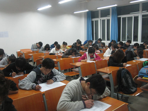 考试分09级和10级两个教室进行,采取笔试的形式进行。负责监考的是球探体育