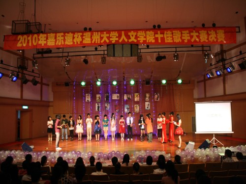 晚会在院艺术团的热舞中开场,正式的决赛分为两轮,第一轮十四位选手两两成组进行对唱,第二轮则是选手们进行独唱,由评委进行打分后按比例相加得出总分,期间掌声不断,高潮迭起。选手们精彩的表演彻底折服了现场的观众。比赛间隙,还有幸运抽奖、嘉宾演唱等环节。最后主持人宣布最终得分,来自10广本的戚丽姗夺得第一名,骆老师和曾老师为新诞生的十佳歌手颁奖。比赛在一片喜悦的气氛中圆满落幕。