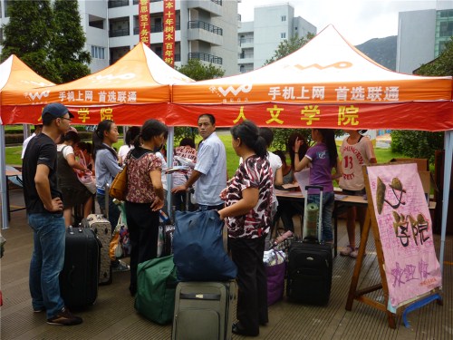 早上6:00左右,志愿者们就进行了合理的分工,积极投入到迎新大潮中。C区门口有专门指引新生找到本学院迎新大本营的志愿者,为新生提行李,并带领学生及学生家长领取相关资料。新生会拿到一个新生指南、学生手册、院刊等资料的文件袋,在大本营签到后新生还将领到寝室钥匙,由另几名志愿者协同提行李,引领新生去寝室。这一天,接待处热闹非凡,志愿者们都热情昂扬,积极为新生们提供各种力所能及的服务,大二学生虽因军训冲突,但是仍有不少志愿者自愿利用休息时间为新生服务。接待工作一直持续到晚上九点才基本结束。