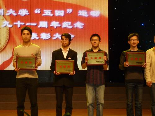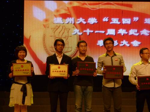 08历本班团支部和07广本班团支部分别荣获“温州大学2009年度五四红旗团支部标兵”和“温州大学2009年度五四红旗团支部”荣誉称号。晚会现场,球探体育