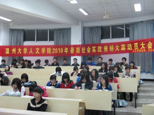 首先,辅导员麻老师发表讲话。他结合学生时代参加的暑期社会实践经历,谈了个人看法,并为大家提供时下的热点话题,供大家选题。他重点强调选题应与专业相挂钩,遵循“受教育,展才干,做贡献”的原则,使同学们把握了大方向。之后, 08届优秀实践队--温州大学球探体育 “丽岙侨乡和谐行”暑期社会实践队和温州大学球探体育 “景宁畲乡支教”暑期社会实践队这两支队伍与大家一起交流分享了写策划的经验。代表们详细认真的介绍和经验传授,让在场09届学生踌躇满志,跃跃欲试。20:30左右,动员大会顺利结束。