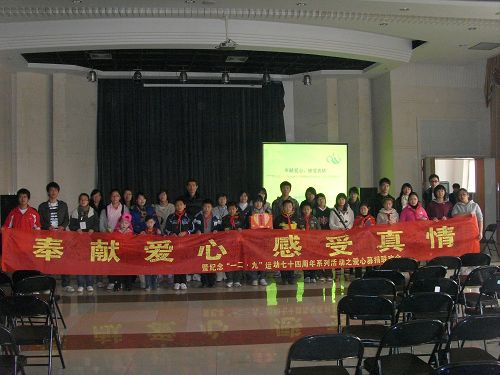 各班团支书上台,在阵阵掌声中依次将募捐款投入爱心募捐箱中。活动的最后,青年志愿者们带来手语表演《感恩的心》,并现场教小朋友们和在座的大学生学手语,留下了感人的一幕。