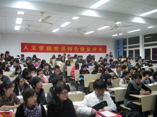 此次评比旨在进一步体现学生党建工作进公寓的有利之处,充分调动学生党员责任感、使命感、党员意识,推进党员先进性示范工程深入开展,激励更多同学向党组织靠拢。16个寝室的党员代表依次上台以PPT的形式展示了自己寝室的风采,并由教师评委和学生大众评委现场打分。比赛的最后,曾蓓蕾老师对各参赛党员寝室作了简要点评。评比结果将在三天后公布。