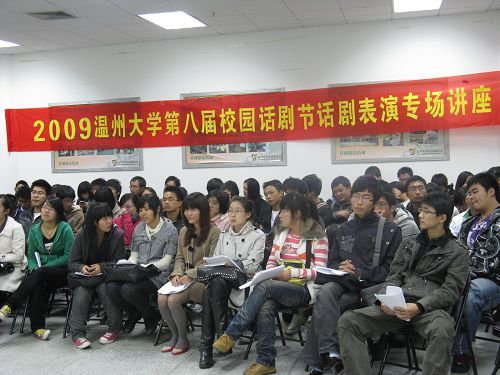 2009年11月30日18点30分,2009温州大学第八届校园话剧节话剧表演专场讲座在大学生活动中心素拓办公室举行,毕业于中央戏剧学院的知名演员、副导演周乔龙老师担任主讲。