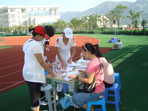 上午7点30分,运动会还没开始,志愿者已经早早地来到操场上做好准备工作。开幕式结束以后,志愿者戴上帽子,活跃在各个比赛场地。顶着烈日,志愿者们有的在做裁判助理,有的在搬运比赛器材,有的在服务运动员,忙得不亦乐乎。下午活动结束以后,志愿者们开始整理场地,回收各个比赛区的器材,清理运动场上的垃圾。整个运动会过程中,志愿者们都是随叫随到,没有人抱怨没有人退缩,辛勤奔走的身影成为运动场上一道亮丽的风景线。