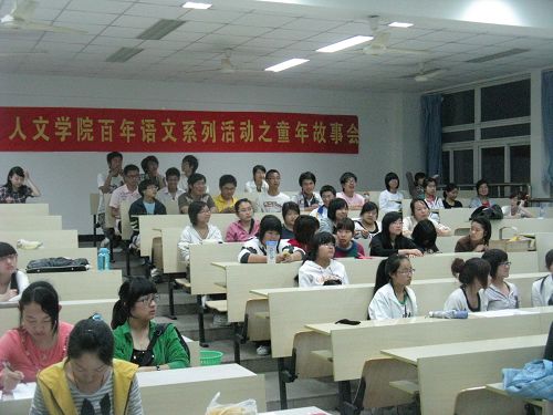 与教育学院的同学们。活动中,同学们发挥特长,各显神通,绘声绘色地为同学们带来了丰富精彩的故事。教育学院为同学们带来了有趣的童话故事《驼背的小龙虾》,甜美的声音,生动的内容,丰富的动作表演,让同学们都陶醉其中。《我的婶婶》以及改编的《灰姑娘的故事》,通过话剧表演的形式,生动形象地道出了“善”的主题,赢得了评委以及观众的声声喝彩。07历本的陈辰立同学,结合自己的专业知识,为同学们讲解了管仲的故事,让大家在听故事的同时,学到了不少历史知识。充满童趣的童话故事,再现史实的历史故事,“童年故事会”进行得如火如荼。最终,08音乐、08中本三、08英语等六组选手获得了进入决赛的入场券。活动在商学院白岩虎老师的点评和赞扬中完满结束。