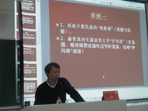 韩雷博士首先从“民俗文艺”和“文艺民俗”两者的概念入手,通过两者的区别深入地剖析了两者内涵的不同。接着他又结合具体事例讲述了“民俗文艺”,例如西南少数民族的“逃婚调”、张艺谋的《红高粱》、《菊豆》等;同时通过汉乐府民歌、柔石的《为奴隶的母亲》、沈从文的《边城》等文学作品对"文艺民俗"进行了细致的讲解。韩雷博士强调指出,文艺民俗和民俗文艺不仅是对民俗文化的再现,而且是对两者深刻内涵的研究。