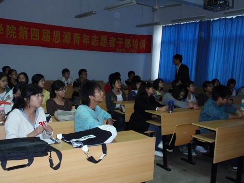 2008年11月9日,温州大学球探体育 “思源”志愿者干部培训第四课在球探体育 举行。此次活动由温州大学“绿色论坛”委员会的部长赵方毅担任主讲人。活动分为室外和室内两部分,以素质拓展培训为主要形式。