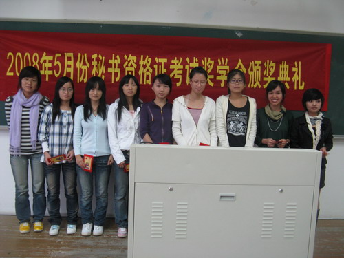 首先由孙老师发表讲话。他详细地为大家介绍了奖学金的颁奖标准。这些奖学金颁给在5月份的秘书资格证考试(高级)中取得佳绩的同学。成绩在85分及85分以上的同学获奖学金500元,80分以上(含80)85以下的获得300元,60分以上80分以下的获200元。孙老师宣读完获奖者的名单后,苏燕老师为获奖同学颁奖。之后,参加典礼的全体成员集体合影留念。