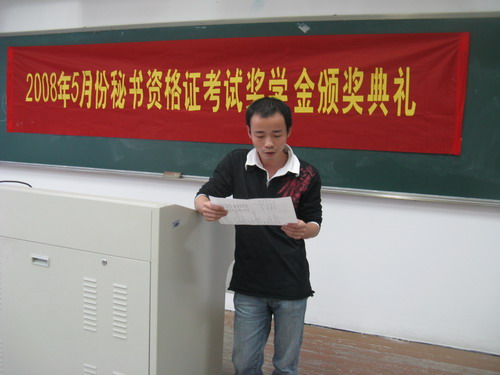 11月8日下午3:30分,2008年5月份秘书资格证考试奖学金颁奖典礼在温州大学北校1号楼201教室举行。颁奖典礼由温州市市点秘书事务所孙邦胜老师主持。参加本次领奖典礼的有秘书资格证考试奖学金颁奖人,即温州市市点秘书事务所的苏燕老师,球探体育 团委学生会素拓部副部长张林峰以及获奖的12位同学。