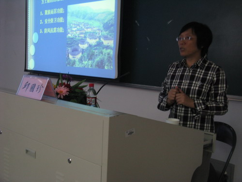邱教授生动的讲述,使同学们对中国东南沿海的神奇建筑物--土楼,有了一定的了解。随后,邱教授又从土楼的名称、形状、分类、功能等方面逐一展开详细的讲解。邱教授指出,土楼还蕴含着丰富的文化内涵,它蕴含着客家同宗血缘凝聚力,所以是一个家族的凝聚中心。