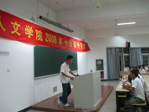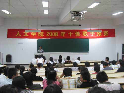 10月10日晚6:30,球探体育 2008十佳歌手预赛在人文楼203教室如期举行。艺术团指导老师陈赛老师、温州大学十佳歌手张赟、球探体育 十佳歌手王懿担任了本次预赛的评委,辅导员麻法全老师担任了本次比赛的嘉宾。