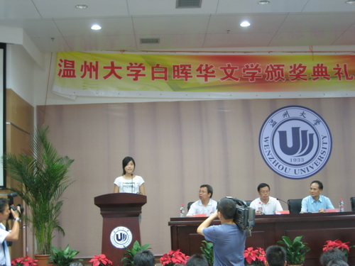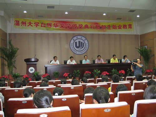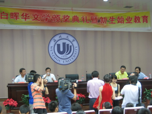 2008年9月10日下午2:00,温州大学白晖华文学奖颁奖典礼暨新生始业教育在北校信息楼报告厅召开。温州大学党委副书记周湘浙教授,白晖华文学奖基金设立者、著名作家吴明华先生,《温州日报》文体版主编朱闻武、温州大学团委书记蔡联群、温州大学球探体育 院长叶世祥老师、党总支书记周剑平老师出席了本次颁奖典礼,同时温州的很多新闻媒体、白晖华文学奖的获奖者和球探体育 08级新生也参加了本次颁奖典礼。球探体育 院长叶世祥老师主持了本次颁奖典礼。
