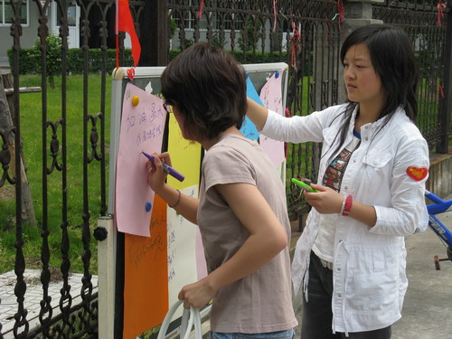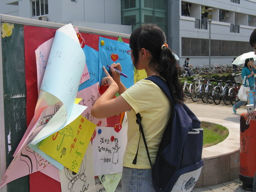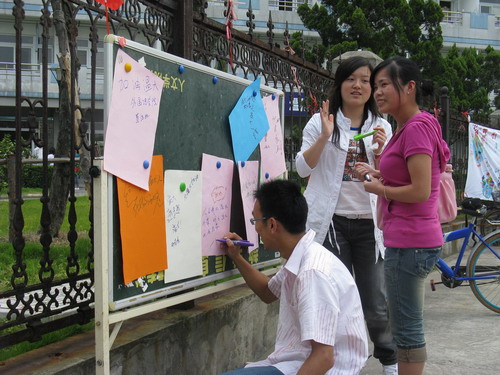 此次活动的主要目的是为了让普通同学在学校迎评期间为学校的进一步建设和发展谈谈自己内心深处的希望与寄托。作为一个温大学子,温州大学的建设与发展不仅关系到我们学生的自身利益,更离不开莘莘学子的努力与奉献。活动在下午1:00准时开始,我们的工作人员在愈来愈热烈的阳光下为来往的同学们讲述"亲近温大"系列活动的精彩内容,同时也积极邀请我们的同学为学校的发展献计献策,谈谈自己心中的温大的未来。工作人员辛勤汗水换来了同学们对此次活动的支持。路过的学生纷纷拿起画笔或接过工作人员递过来的水彩笔,在多彩的纸上构绘自己心中的温大蓝图。有的人勾勒出温大整齐的建筑群,有的人为学校的迎评加油,更有同学用手中的笔写下祝福的话语......