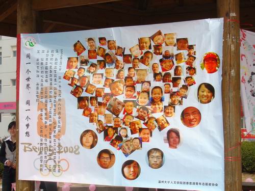 3月15日和16日,人文思源青年志愿者协会在生活区C、B区展开了奥运成果展。本次成果展的活动分为五个阶段,分别在A、B、C、D、E区各展一天。奥运成果展是对上学期思源青年志愿者协会组织的奥运有你有我系列活动"迎奥运,我们在行动"、"益民学校奥运知识大讲堂"、"新码道迎奥运涂鸦活动"、"迎奥运、讲文明、树新风,2008齐转奥运环"的总结和宣传。成果展内容包括发放奥运倡议书,展示奥运有你有我系列活动的写真"八十八张笑脸"及涂鸦"八十八双手印"和"奥运心愿墙"。