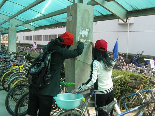 在青协负责人的带领下,志愿者被分为两组,分工合作,共同清理"牛皮癣"。大家秉着"团结合作、洁净校园"的宗旨,仔细寻找小广告、过期海报、过期横幅,并认真清洁。即便手酸了,也毫无怨言,坚持不怕脏,不怕累,干得热火朝天。