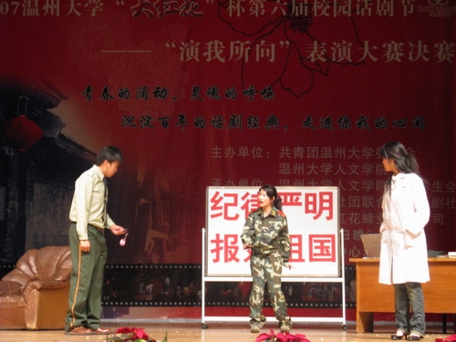 2007年12月27日晚,温州大学“大红花”杯第六届校园话剧节之颁奖晚会在温州大学演艺中心落下帷幕。至此,第六届校园话剧节画上圆满句点。