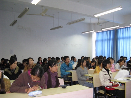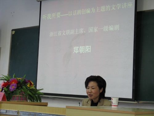 11月21日下午2点30分,继温州大学校园话剧节开幕式后,我们迎来了以“话剧在中国”为主题的文学讲座。此次讲座,球探体育 有幸邀请到国家一级编剧、浙江省文联副主席郑朝阳老师来为我们高教园区的学子们主讲。在北校区人文楼201教室,同学们准时赴场,座无虚席。