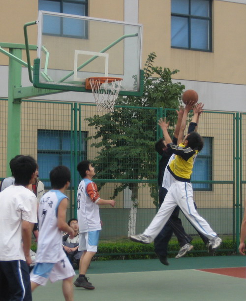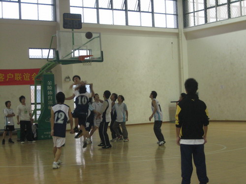 篮球赛在室外篮球场准时开赛。随着一声哨响,05历本的同学首先同06中本1、2及瓯文秘联队展开厮杀。双方水平相当,难攻难守,一时进入拉锯战。稍后,05中本2、3与04中本3也开始对决,04中本3班以压倒性的优势连连灌篮得分。随着时间的推迟,操场上气温更低,冷风袭来几乎有些刺骨,而我们的运动员却仍全神贯注,大汗淋漓。