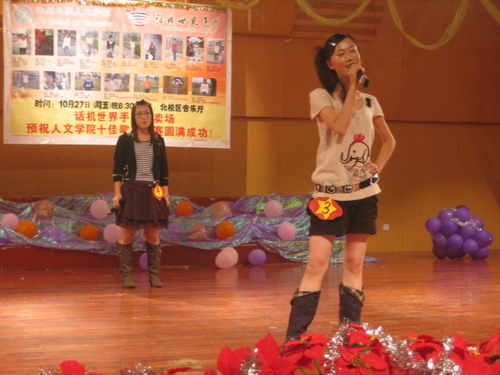 正当气氛热闹喧嚣时,一号选手朱虹安静恬美的声音如清风一样沐浴过观众的心,大家屏气凝神地享受她带来的《The day you went away》,青春旋律刹时响起来。一首悠扬婉转的《美丽心情》,一首慷慨激昂的《从头再来》,一首清新脱俗的《那么骄傲》,一首唱功绝佳的《值得》,一首深情似水的《温柔》,加上嘉宾曹建权的萨克斯表演与陶源的歌曲《手放开》,使得台上的高潮一浪翻过一浪,观众与之呼应争先恐后地献花,人潮涌动排队上台给喜爱的选手一个拥抱,或是挥舞手中的荧光棒,响彻云霄的掌声,大赛异常成功,赢得了其他学院众人的一致好评。