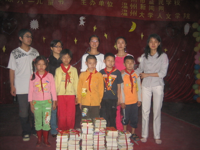 在节目的最后,温州新闻网的同志为孩子们送上了温州网网友们捐赠的数百册课外读物,来充实益民的“爱心图书馆”。为表诚意,益民校方向新闻回赠了“热心支持教育事业”的纪念牌匾,益民师生代表、志愿者代表、新闻网代表进行了合影留念,演出取得圆满成功。