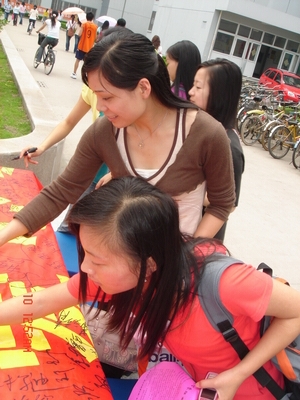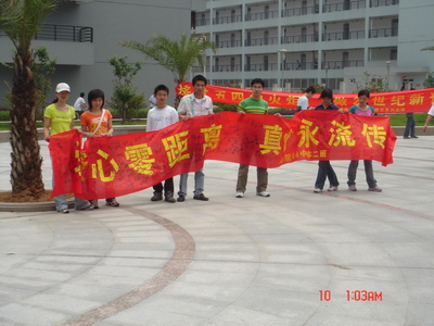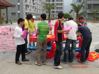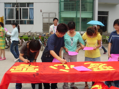 04中本二班团支部的同学们在C北区的活动广场开展了“爱心零距离,真情永流传”的主题团日活动。五月的骄阳炙烤着大地,但是,为了能让更多的人了解爱心超市,关注爱心超市,同学们还是选择了在中午这个人流量最多的时间段。活动中,以海报的形式向生活区的同学老师介绍了爱心超市的一些具体情况和超市目前所存在的困境,呼吁全体同学向他们伸出援助之手。本班全体同学在印有“爱心零距离,真情永流传”的爱心横幅上签名,接着我们向生活区的同学发放了宣传单,他们也在爱心横幅上签名。
