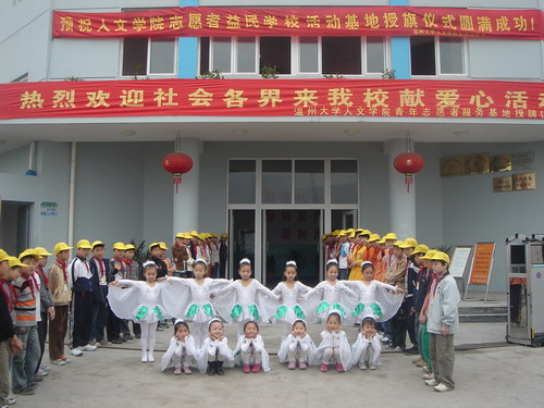 天公不作美,在益民学校门口召开授牌授旗仪式时,下起小雨,但是这丝毫也没有影响到大家的热情。仪式过程中魏成春老师代表讲话,表达了我们学院、青年志愿者的心声,最后仪式在同学的精彩表演中结束。