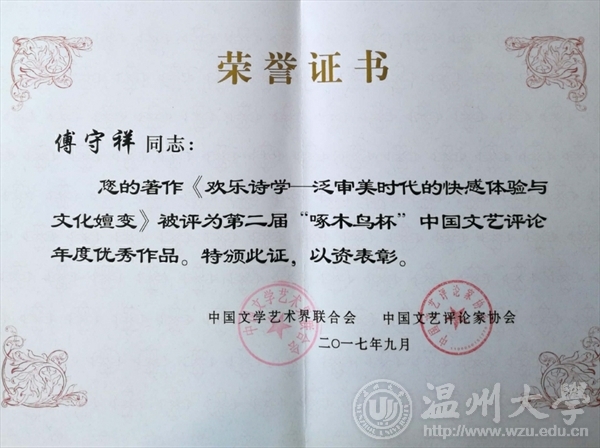 9月26日,由中国文联、中国文艺评论家协会主办的第二届“啄木鸟杯”中国文艺评论2017年度推优活动发布大会在北京中国文艺家之家隆重举行。中国文联党组成员、副主席郭运德、中国文艺评论家协会主席仲呈祥等出席典礼并为获奖者颁发了“啄木鸟”杯和荣誉证书。温州大学特聘教授傅守祥的专著——《欢乐诗学:泛审美时代的快感体验与文化嬗变》获评2017年度“中国文艺评论优秀作品”并应邀参加了颁奖典礼。