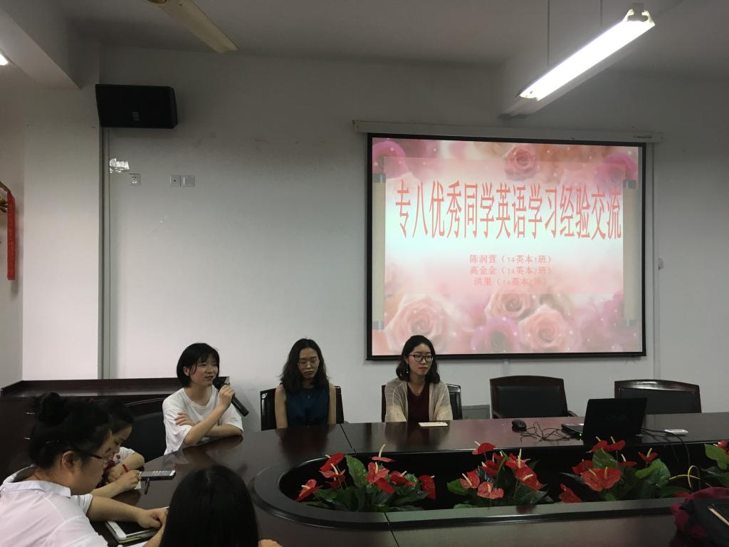 2018年6月19日晚,在外语楼212教室,球探体育 外语系和翻译系举行2018年第8场“外语类专业专四专八辅导讲座”,讲座邀请了球探体育 2018年专八成绩优秀的陈润萱(14英本1班)同学、洪果(14英本2班)同学和高金金(14英本2班)同学与大家交流英语学习经验。会议由外语系主任杨开泛博士主持。