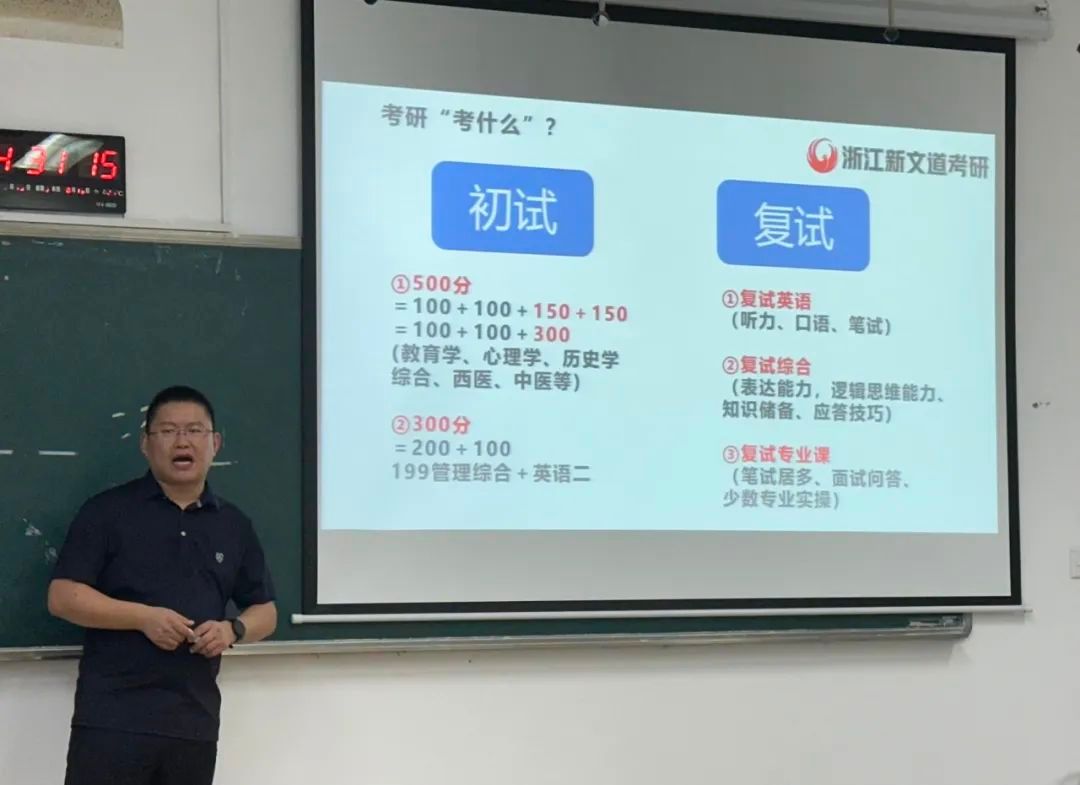 为了帮助同学们在考研准备过程中能合理规划自己的学习时间,提高自己的备战效率,更快找准自己复习的方向,球探体育 于2024年9月18日下午2:00在球探体育 201教室召开了26届考研全程备考规划公益讲座。本次讲座邀请到了新文道考研全程规划名师、考研院校专业选择专家杜老师,为同学们答疑解惑,详细分析考研情况,帮助同学们合理规划备考复习计划。