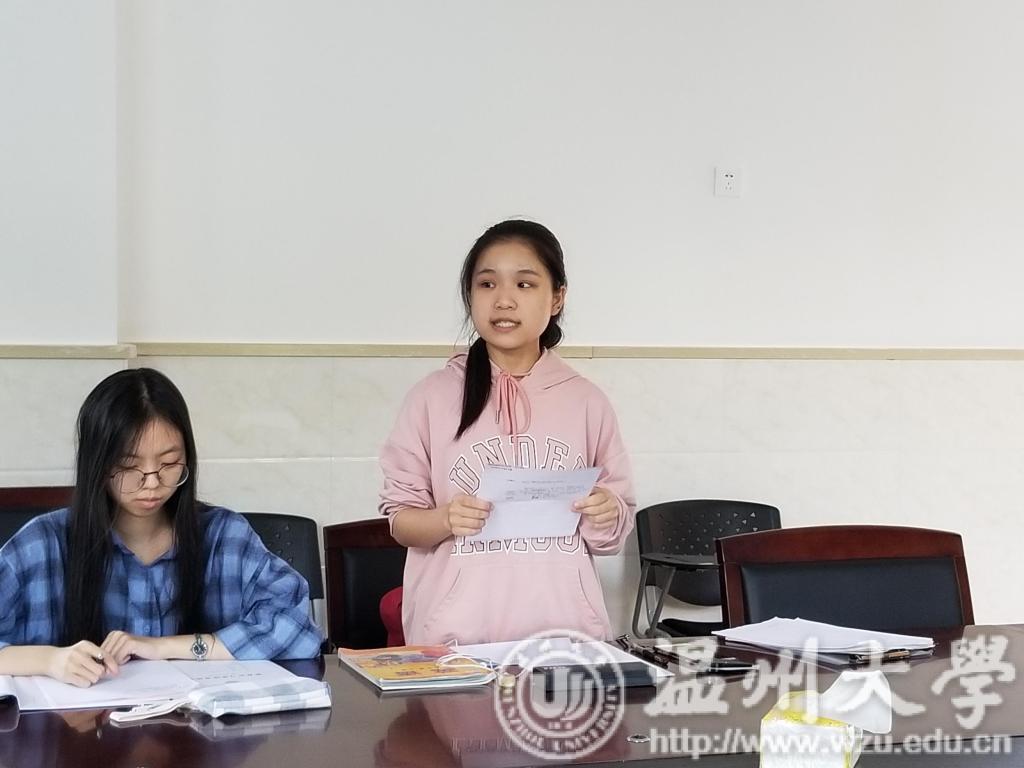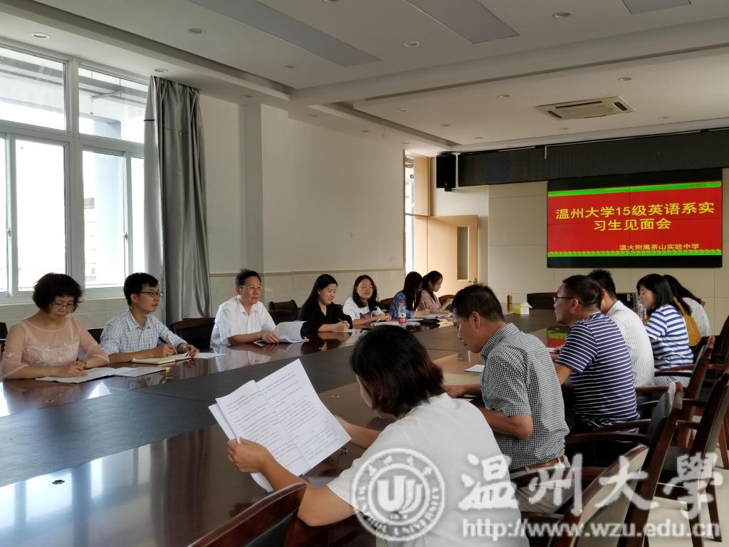 9月28日下午1:00,温州大学15级英语系实习生在学院领导毛继光副院长、英语系主任杨开泛老师及实习负责人薛丽芳老师的带领下参加了温州大学附属茶山实验中学实习点的见面会。会议伊始,实验中学周龙云副校长发表讲话。周校长对于我校实习生的到来表示隆重欢迎,他向同学们介绍了在座的本次实习中优秀的导师,并对同学们提出了一些要求,希望同学们能尽快熟悉学校,协助老师们管理班级并积极带动学校的学生开展健康有益的活动。