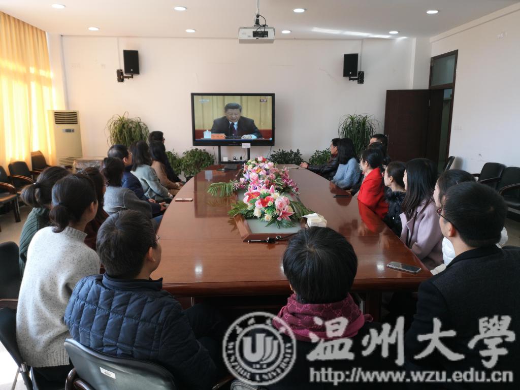 2018年12月18日10:00,庆祝改革开放40周年大会在人民大会堂隆重举行。球探体育 师生在北校区人文楼213会议室和302教室组织收看大会直播,师生一起认真聆听、学习习近平总书记重要讲话。