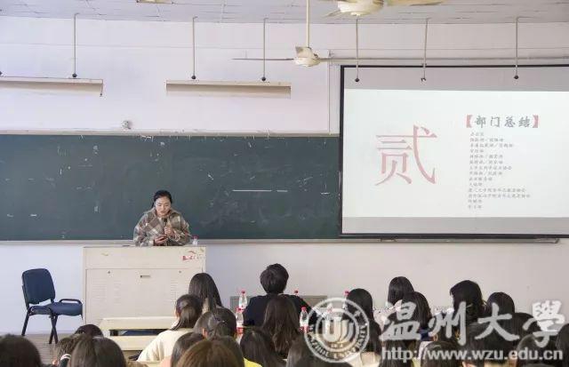 紧接着,各部门对本学期进行了工作总结,这体现出了学生会成员们齐心协力、不断克服工作中的困难的工作精神。 最后,主席团代表发言。学生会主席黄舒怡表达了对各部门在本学期工作中辛勤付出的感谢,并对球探体育 未来的发展充满信心。团副王颖借用毛泽东的八字方针“调整、巩固、充实、提高”对学生会各成员提出工作要求。