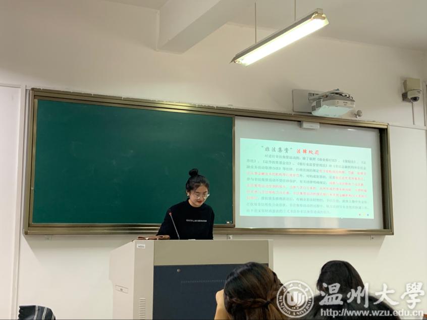 大二的同学们也精心策划了各自的主题班会。他们详细解释了“非法集资”的形式,全面分析了非法集资的特征,多个班级如17英本4班、17历本班等还举出一众非法集资案例以促进同学们对非法集资手段的辨别和了解。17翻译2班更是别出心裁地将有关从事非法集资活动的法律处罚条例一一列出,这种方法在同学们的心中敲响警钟,避免他们误入歧途。