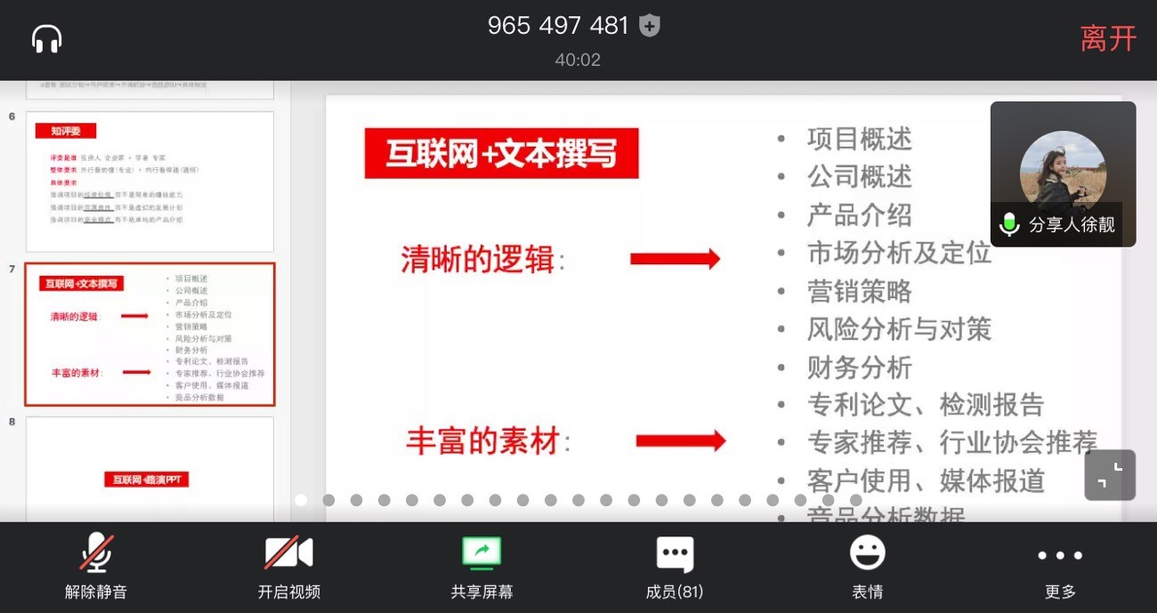 随后,会议进入经验分享环节。球探体育 16广告的徐靓首先进行分享,她详细介绍了“互联网+”大赛的具体概念,并就项目类型、项目设置做出了具体讲解。她强调在赛应前力求做到“知赛事”、“知作品”、“知评委”,不打没准备的仗。同时,她也为同学们讲解了“互联网+大赛”文本撰写、路演PPT制作时需要注意的事项。