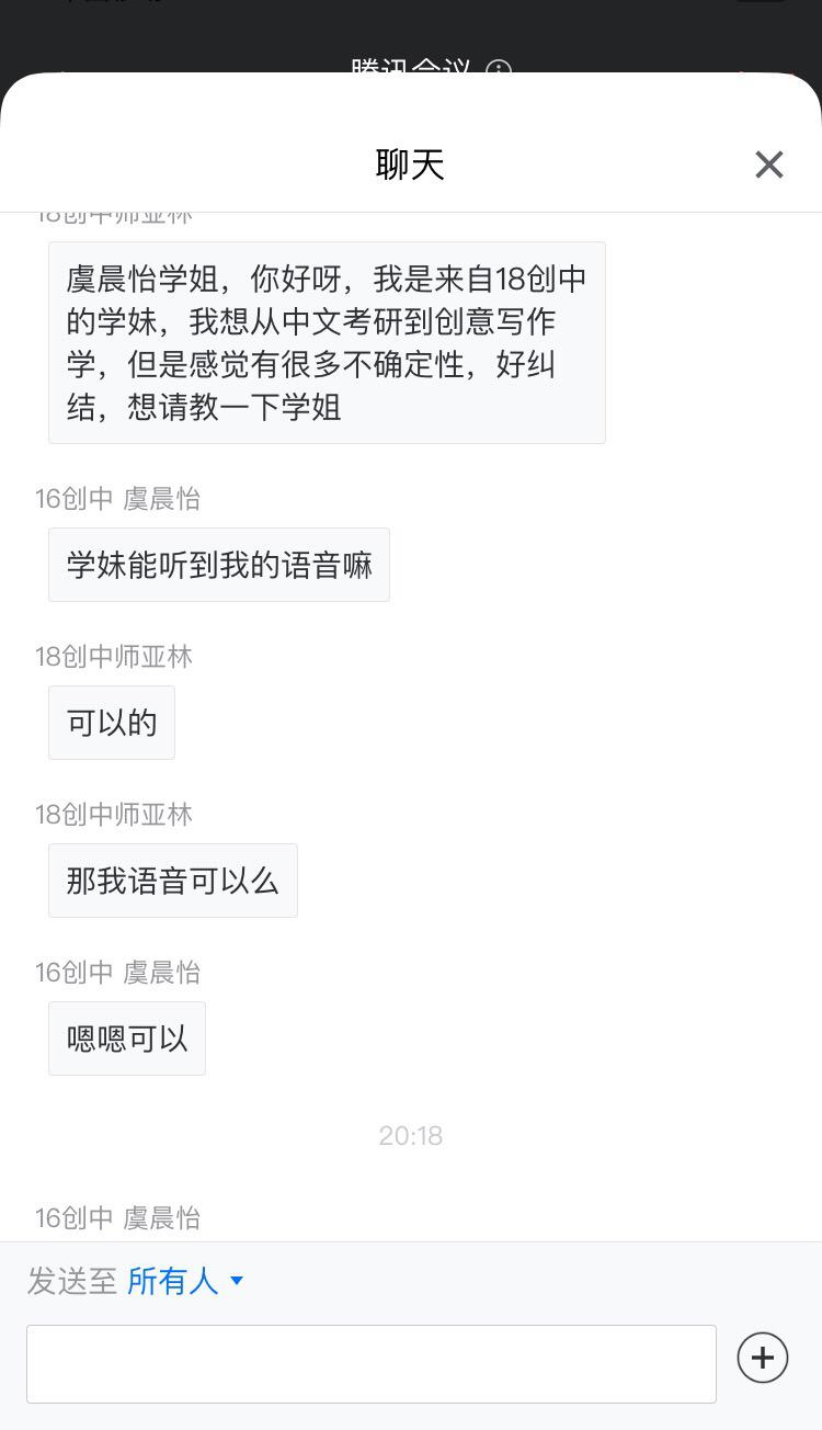 最后是互动交流环节,校友们对问题进行一一解答。此次考研云分享,是球探体育 就业服务系列活动之一,它为同学们搭建了与考研成功学姐交流的良好平台,有助于同学们清晰自己的定位,朝着彼岸和远方进发!