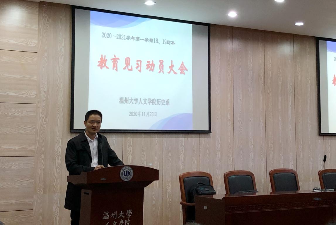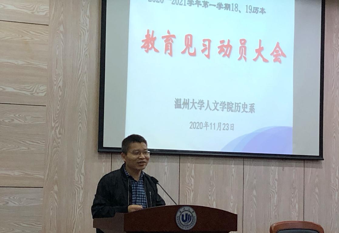 2020年11月23日,温州大学球探体育 历史系召开2020-2021学年第一学期18、19历本教育见习动员大会。会议由阙仁镇老师主持,球探体育 历史系部分领导与老师出席,18、19历本全体同学共同参加本次动员大会。
