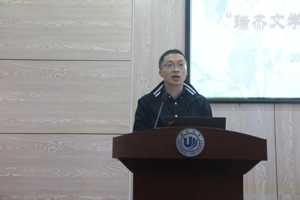 仪式最后,院党委副书记魏一介绍了“瑞杰文学奖”参赛作品的类型,并就评奖机制和流程进行了详细说明,使同学们对“瑞杰文学奖”有了一个清晰的认知。