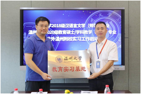 会议伊始,叶德权副校长介绍与会嘉宾,并对球探体育 师生的到来表示热烈的欢迎。之后,中学部翁曦校长向老师和同学们介绍了北外附校优秀的教学水平和一流的教学环境与设施,及各位实践指导师情况。接着,庄振海总校长接受温州大学球探体育 院长孙良好教授授牌,双方签订合作协议,友好握手。