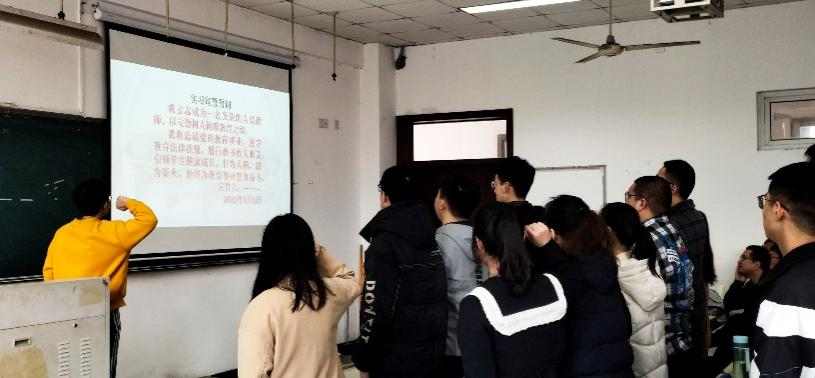 在动员会上,19历本全体学生集体肃立,在李思羽同学的带领下,对本次教育实习任务庄严宣誓,“我立志成为一名光荣的人民教师,以立德树人铸就教育之魂。我将忠诚党的教育事业,遵守教育法律法规,履行教书育人职责,引领学生健康成长,甘为人梯,愿为薪火,始终为教育事业努力奋斗。”
