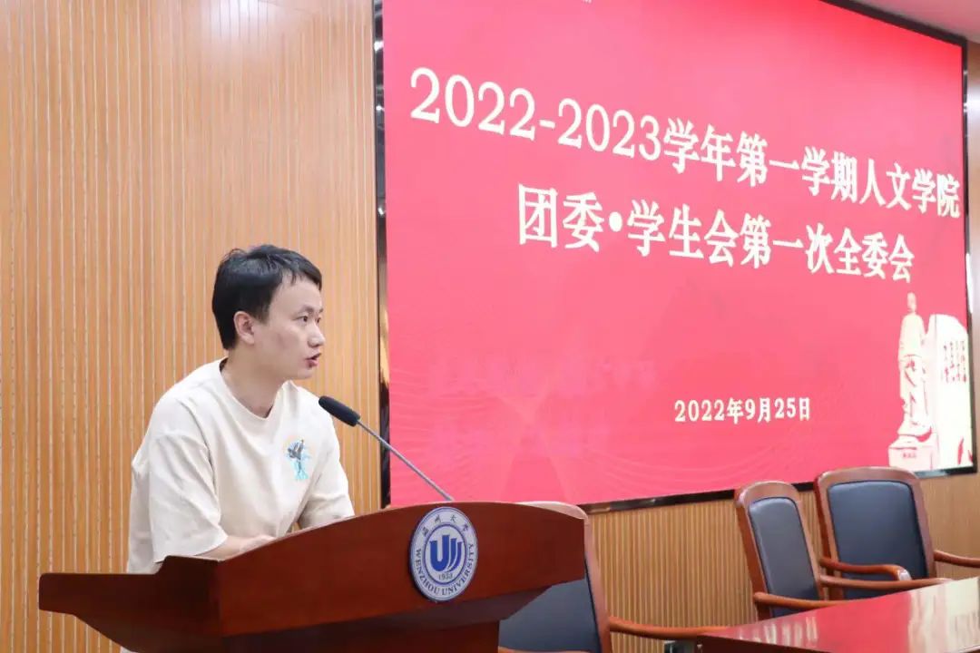 秋风始至,排云初展。9月25日,球探体育 团委·学生会2022-2023学年第一学期第一次全体委员会于人文楼203报告厅召开。球探体育 学工办副主任兼团委书记申业磊老师,学工办辅导员谭黄老师,团学主席团及全体团委·学生会成员悉数与会。