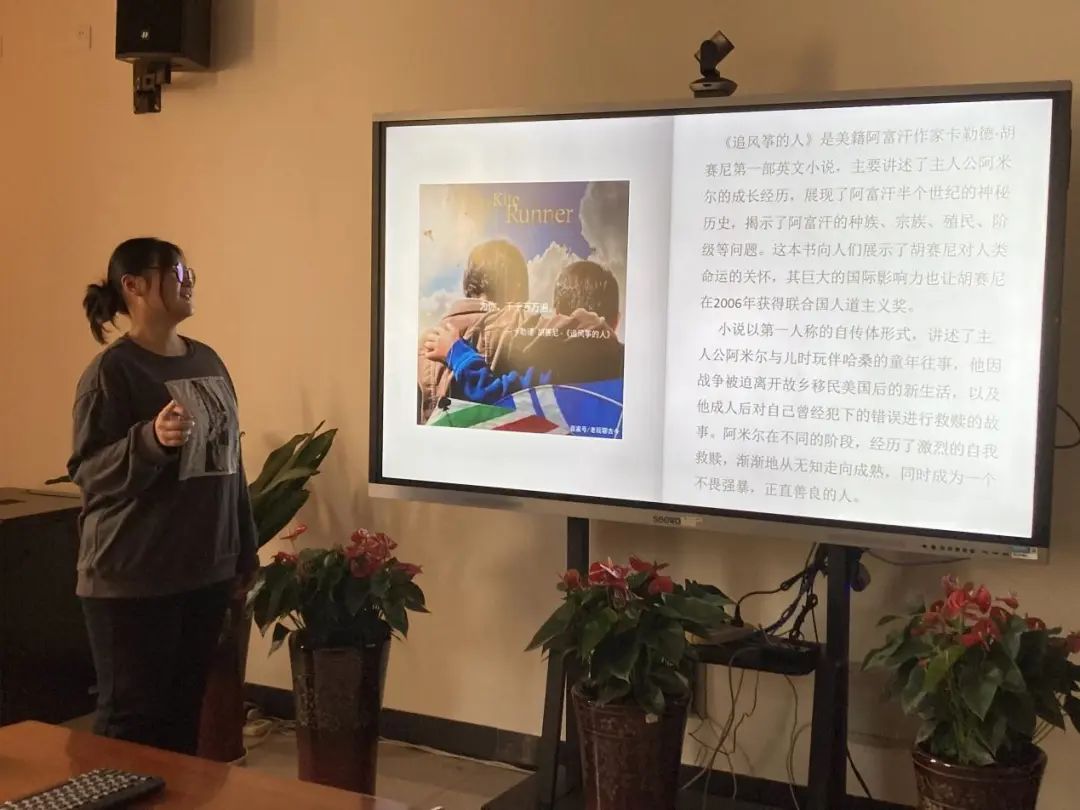 郭春玉同学推荐的作品是《追风筝的人》,她首先对作者进行了介绍,之后对作品的主角及内容进行讲解。她认为,这本书用“风筝”这个意象,完美地将命运的无常与悲惨、人性的脆弱与孤独、愧疚灵魂的痛苦挣扎与救赎放飞出来。这只越飞越高的风筝,寄托了作者对勇敢顽强的民族精神的崇敬、对故土深深的眷念、对生命的赞歌以及对和平由衷的向往,敦促人性去始终不渝地追寻良知与忠诚并回归到弃恶扬善的救赎之路上来。