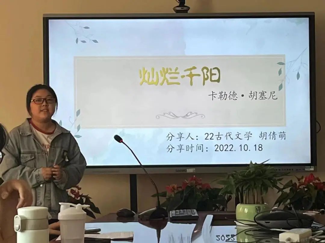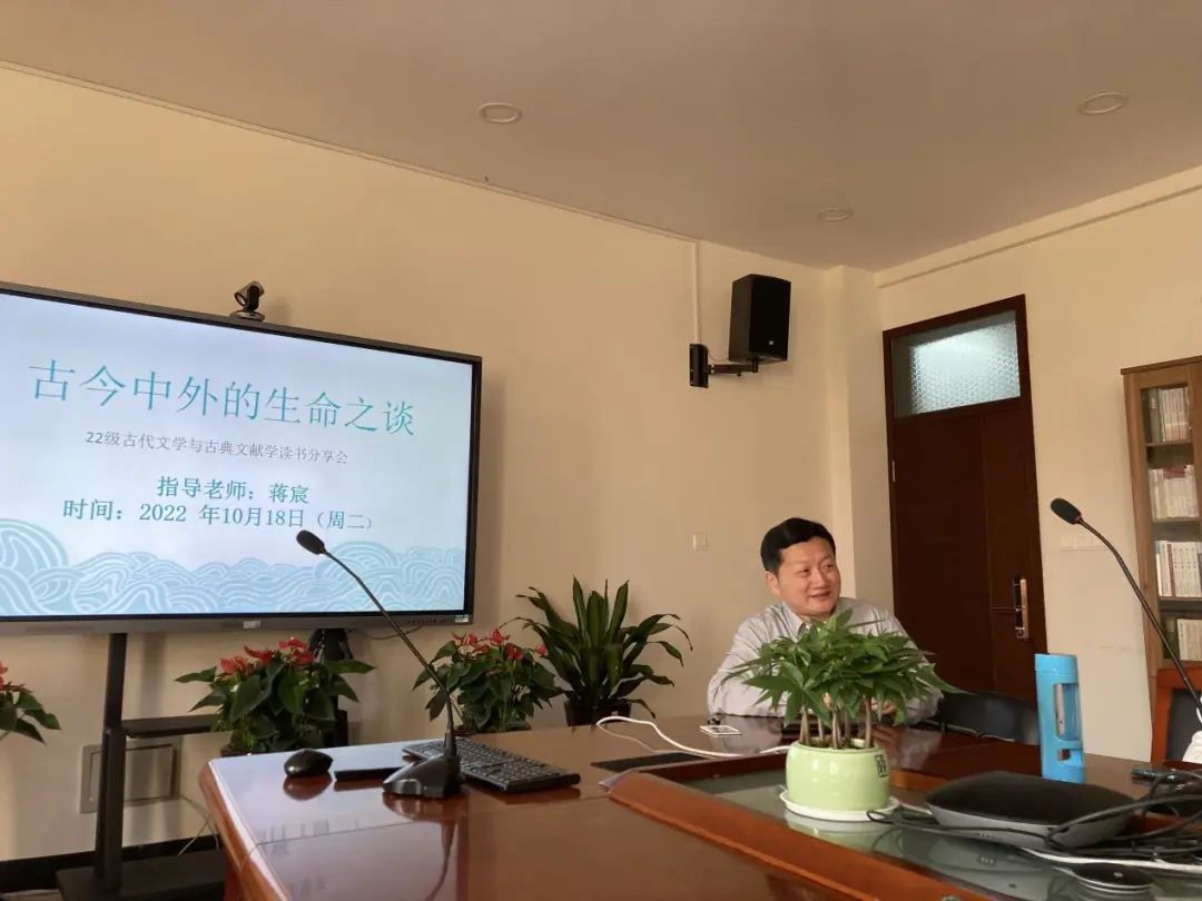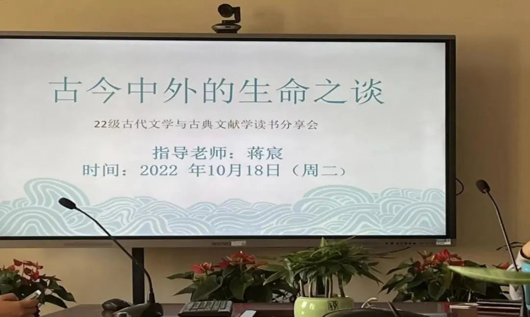 2022年10月18日下午,2022级古代文学、古典文献学专业的16名同学在人文楼213会议室举办了主题为“古今中外的生命之谈”的读书分享会。本场分享会由黄琦琦同学主持,邀请了蒋宸老师参与指导点评。会上,董心怡、胡倩萌、郭春玉、陆珂玥、卢宏亮等五位同学分别从不同角度分享了自己的阅读体会。